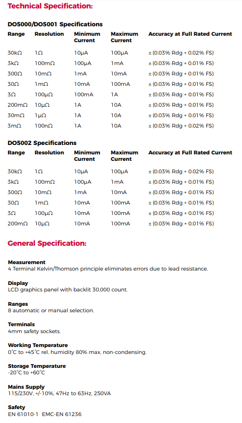 The DO5001 micro ohmmeter encompasses all the features required of an ohmmeter in one instrument.