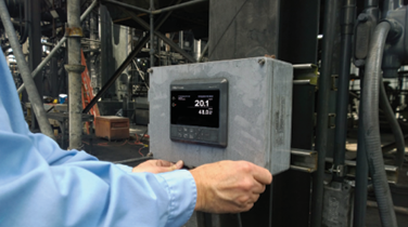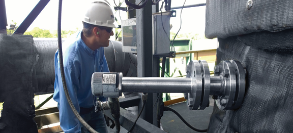(건조 드럼 출구에 설치된 PS 10 센서가 안정적으로 운전되고 있으며, Auburn 엔지니어가 제어 장치 디스플레이를 확인하고 있습니다.)