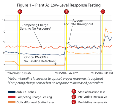 Plant A는 Auburn 장비를 경쟁사의 전하 유도 방식 장비 및 광학식 PM CEMS와 비교 테스트하였으며, 약 1개월의 초기 운전 이후 백하우스 필터에 인위적으로 누설을 발생시켜 배출 증가 상황에서 성능을 비교하였습니다.