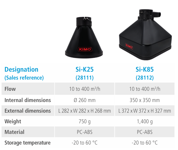 The Si-K25 and Si-K85 are perfectly suited to Kimo LV 110 and LV 130, VT 210, MP 210 and AMI 310 anemometers.