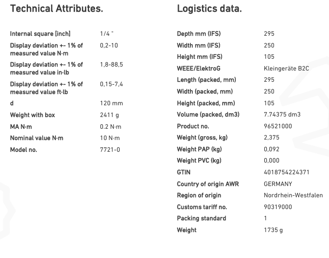 | Product no. | Model | Model No. | Area of application | Accuracy +- 1% of the measured value N·m | Accuracy +- 1% of the measured value ft-lb | Accuracy +- 1% of the measured value in-lb | MA N·m | Nominal value N·m | d | Internal square [inch] | Weight (g) | Weight with box | |