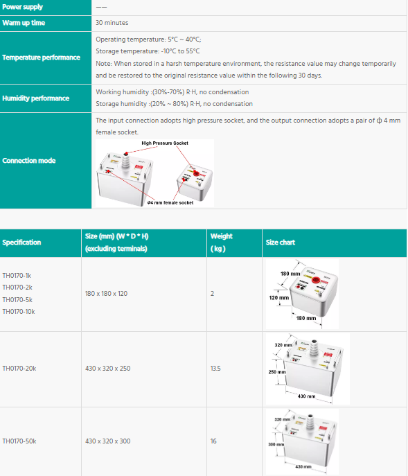 TH0170 is a series of six precision DC high voltage dividers with different range specifications, which can convert DC high voltage to 10 V voltage output.