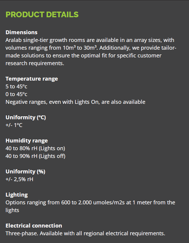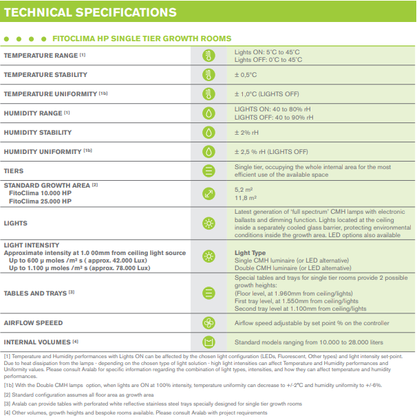 FITO CLIMA HP "WALK-IN" Aralab’s ‘HP’ Growth Chambers cater to tall plants requiring high light intensity and ample growth height. In these single-tier chambers, lights are ceiling-mounted to mimic natural sunlight. Boasting outstanding temperature, humidity, airflow, and photo-period control, and complemented by a broad array of options, they are versatile enough for virtually any plant research scenario.