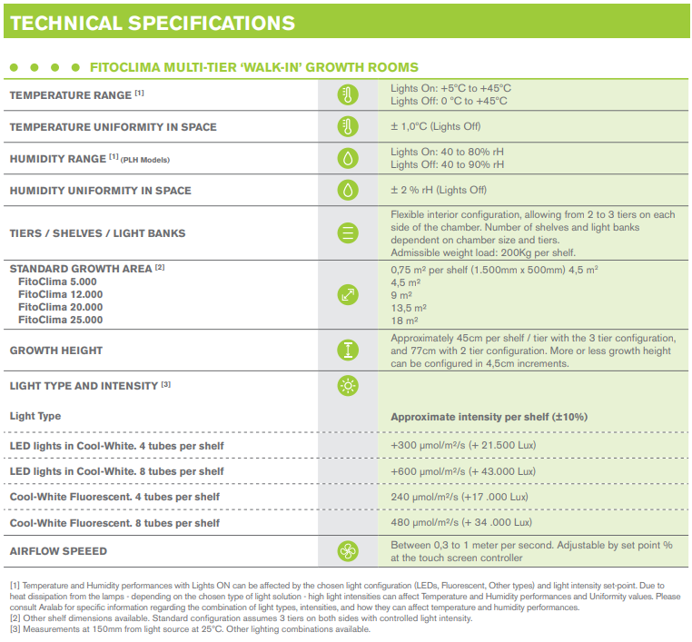 FITOCLIMA PLH “WALK-IN” Growth Rooms ranging in internal volume from 5m³ to 25m³, or bespoke dimensions, built for biotechnology research. These environmental plant growth chambers guarantee superior control and uniformity across all environmental parameters, including temperature, light, humidity, CO2, and even wind simulation. This precision enables them to mimic conditions necessary for diverse research needs. All these features are readily programmable through an intuitive, color touch-screen controller, empowering researchers to simulate day-night transitions, seasonal shifts, and other complex environmental patterns with ease.