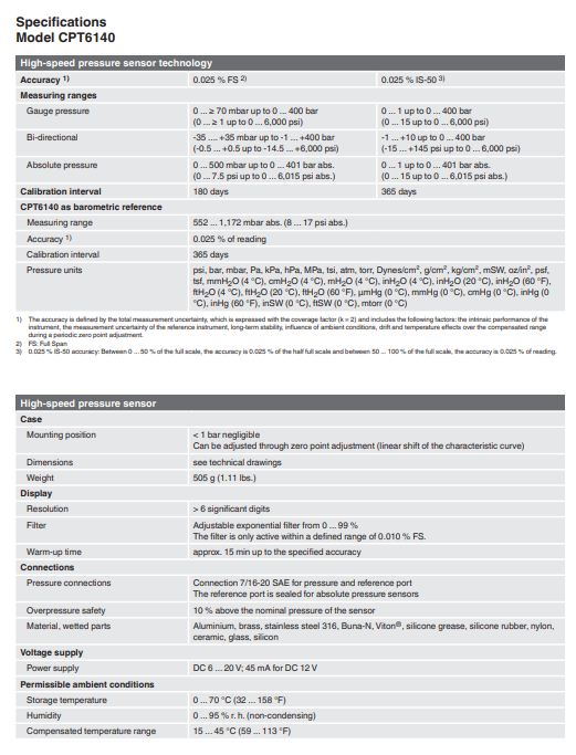 모델 CPT6140는 고속 압력 센서이며 -1 ... 400 bar (-15 … 6000 PSI) 사이에서 자유롭게 선택할 수 있습니다.
