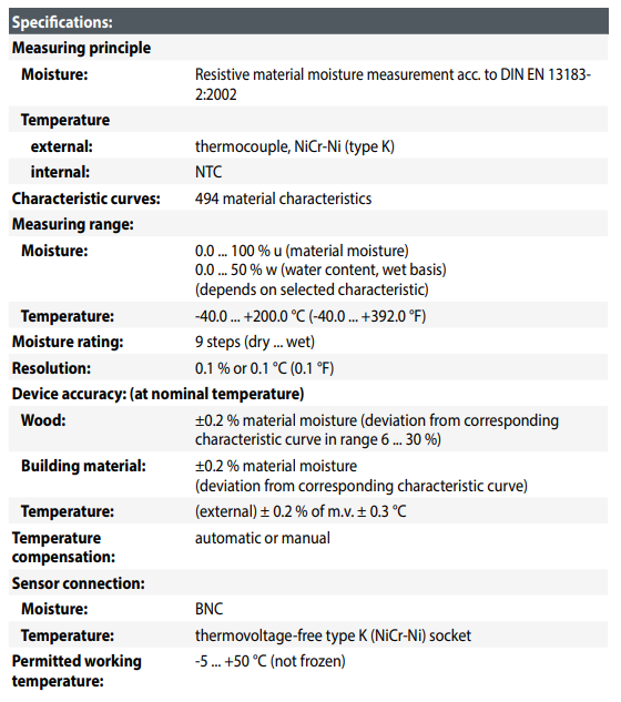 The cumbersome usage of calculation tables becomes a thing of the past. Additionally you get a moisture rating (wet ... dry) of the measured material.